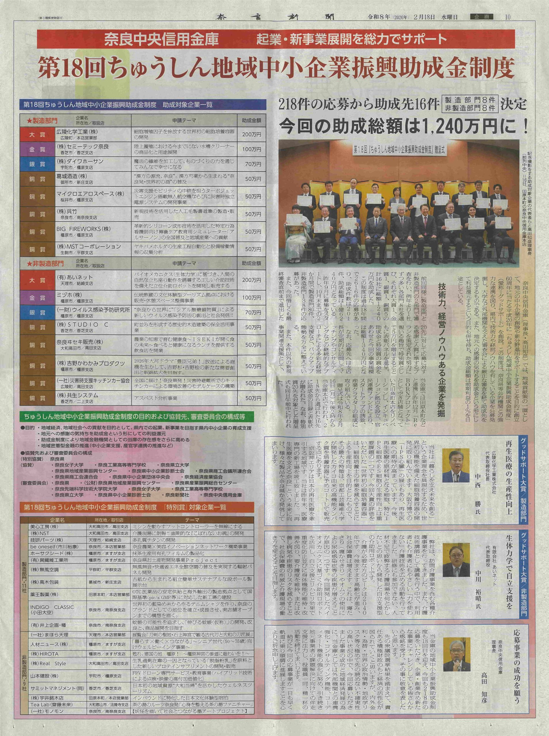 また、本受賞に関する内容は、奈良中央信用金庫様の公式サイトをはじめ、新聞、奈良テレビの公式YouTubeでもご紹介いただいております。