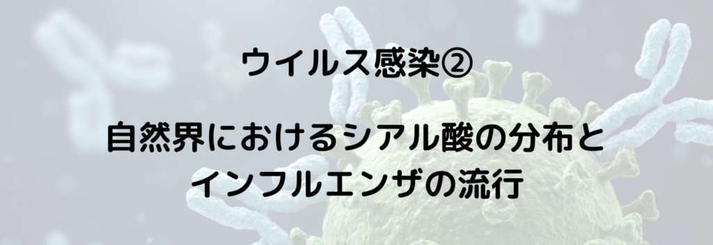 このように多くの脊椎動物の細胞表面にシアル酸糖鎖が存在していることは、ウイルス感染の仕組みとも深く関係しています。多くのウイルスは宿主細胞の表面に結合することで感染を開始しますが、その際の受容体としてシアル酸糖鎖が利用されることが多いのです。インフルエンザウイルスはその代表的な例で、細胞表面のシアル酸糖鎖に結合することで細胞内へ侵入します。